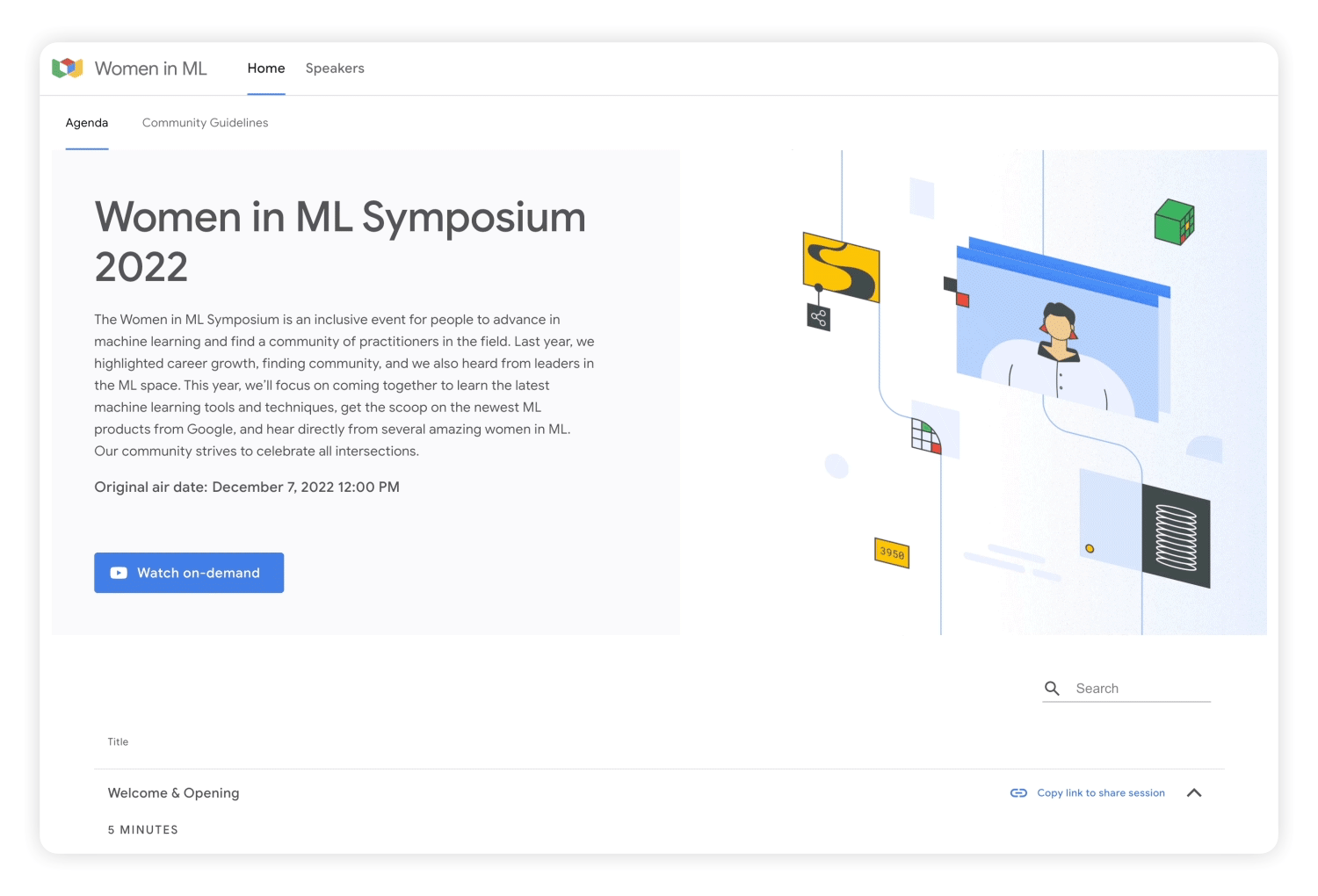 For Google’s annual celebration of Women in Machine Learning (now known as Women in AI), we were tasked with building the visual identity, campaign and run of show assets for the virtual 2022 event.